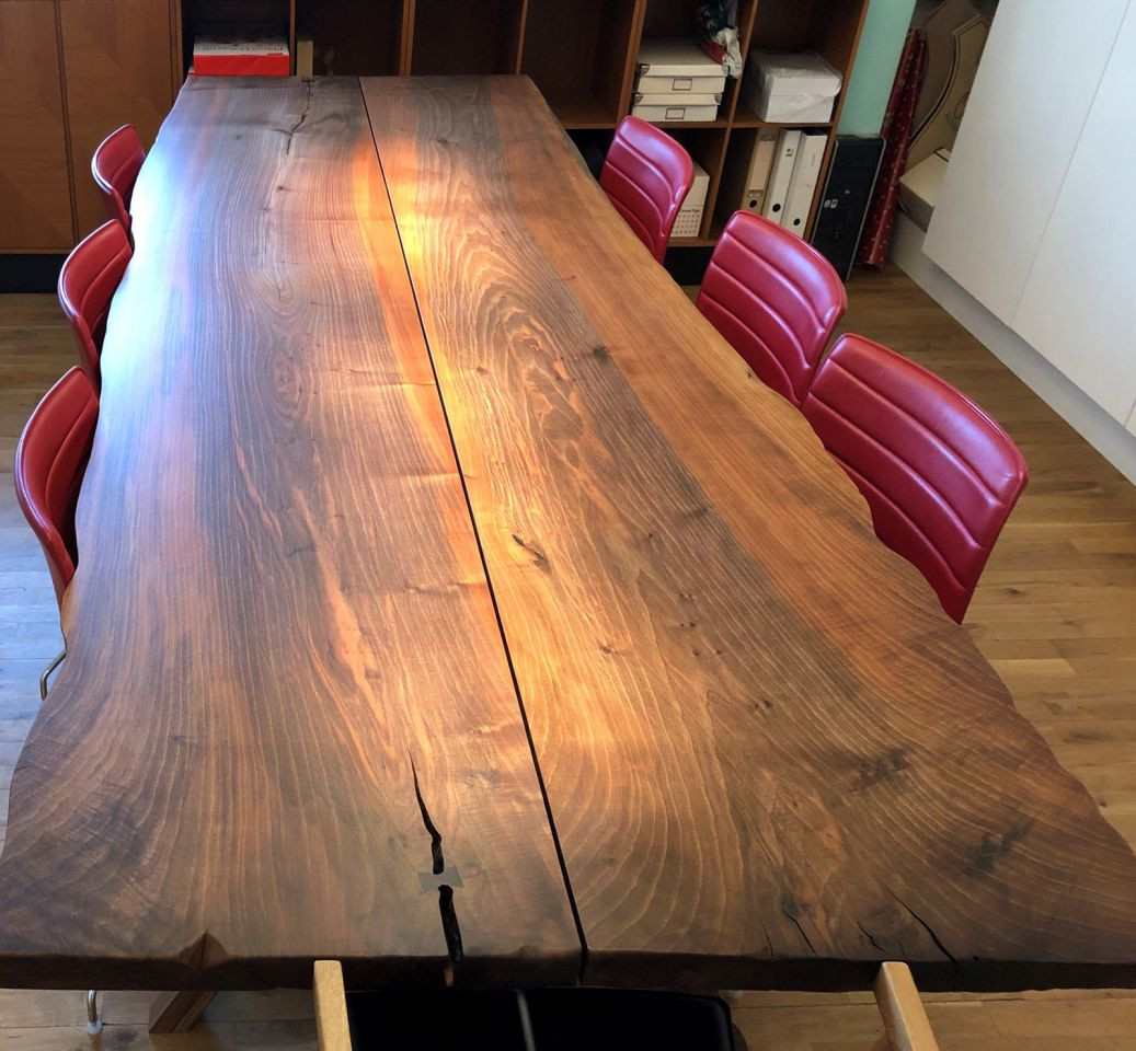 En smuk planke i valnød lå i over 80 år på vores lager. Der havde den ligget siden snedkermester Steen Jönssons farfars tid. Nu er den kommet til sin ret og forvandlet til et smukt plankebord.