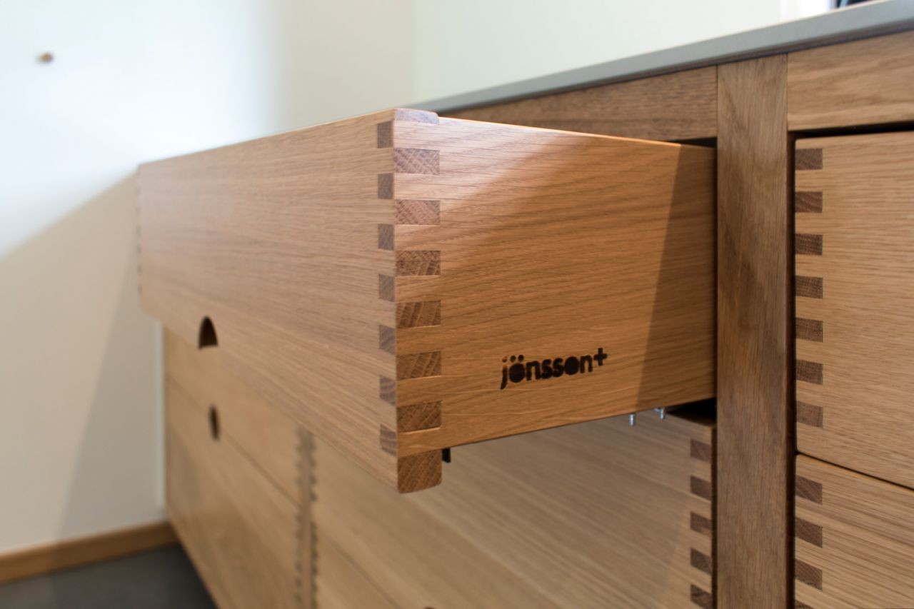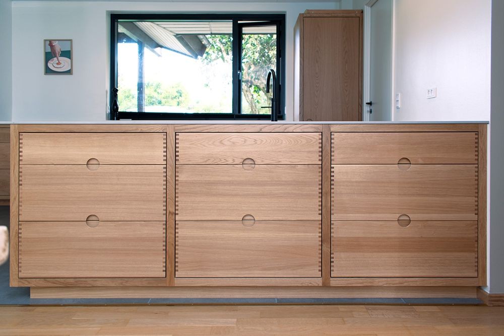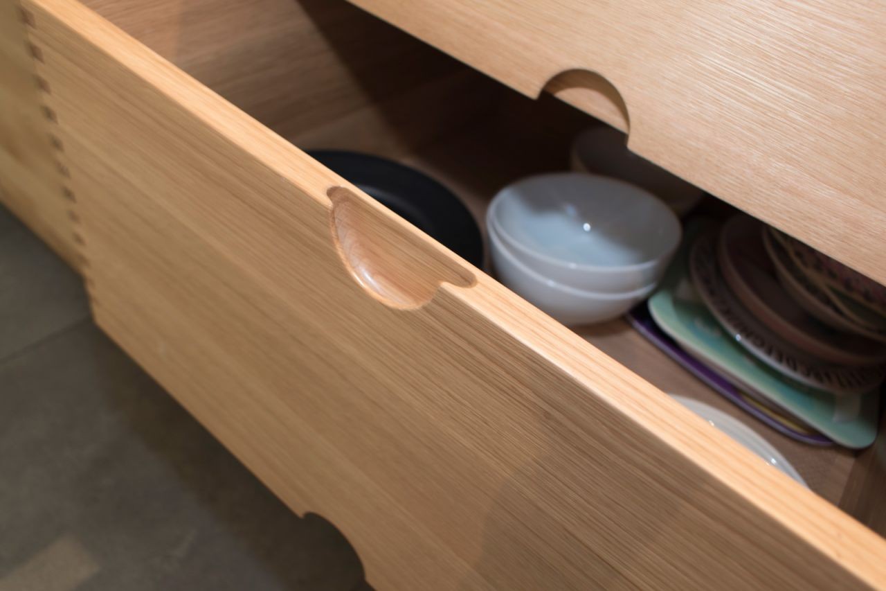 Skuffefronterne har ekstra tykkelse for at give plads til det integrerede greb, som udgør en cirkel når skufferne er lukkede.