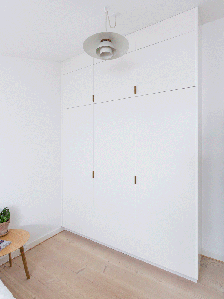 Til en villa på Amager har Jönsson Plus skabt to hvide garderobeskabe til soveværelset. Skabene er blevet til i en tæt dialog med husejerne og er udført med hvidmalede låger og en høj grad af tilpasning til rummets skæve mål. Den unikke indmad består bl.a. af speciallavede skuffer i røget eg med tapsamling samt bøjlestænger og greb i messing.